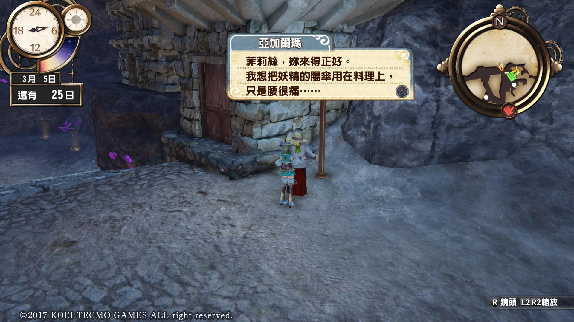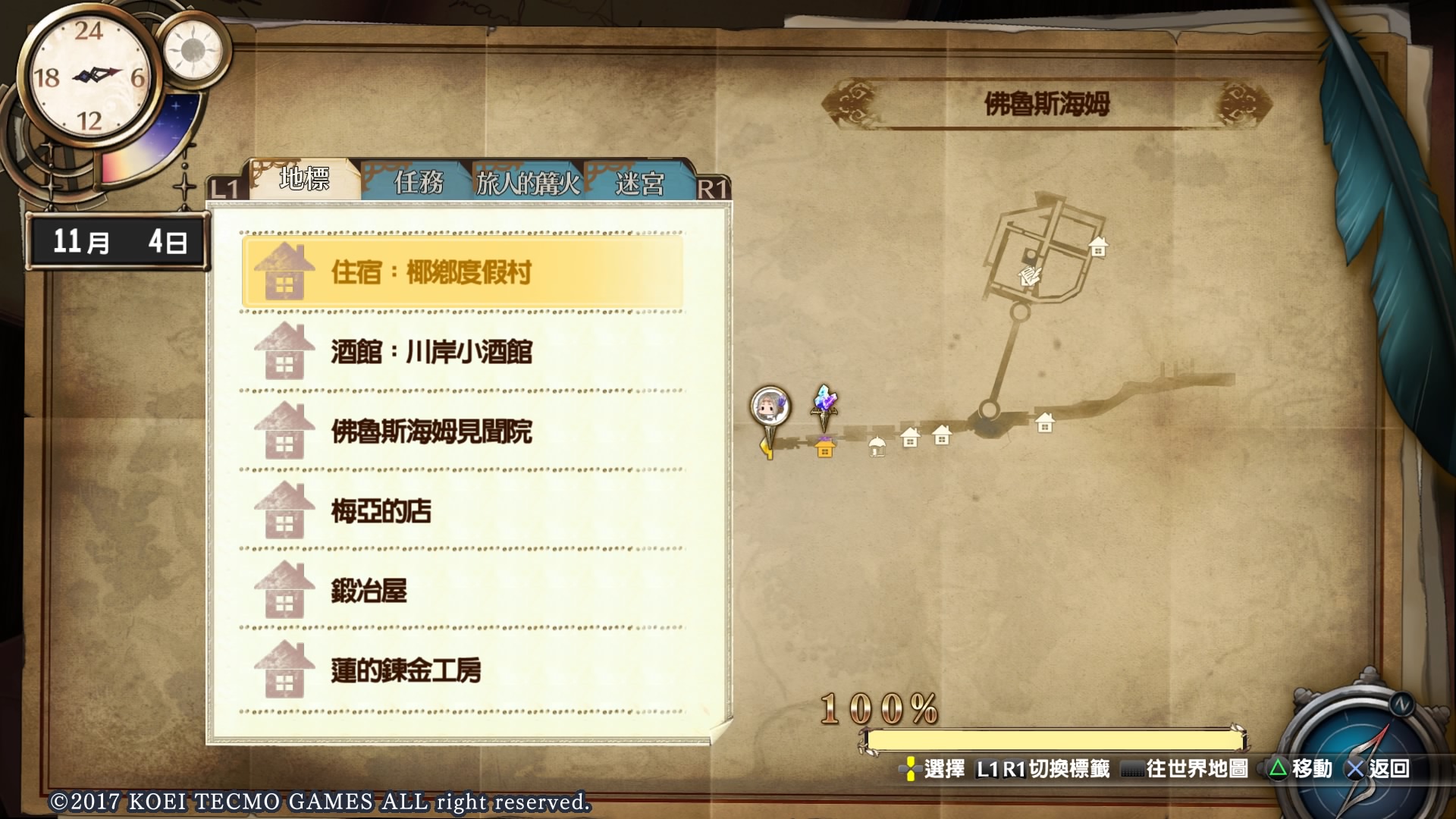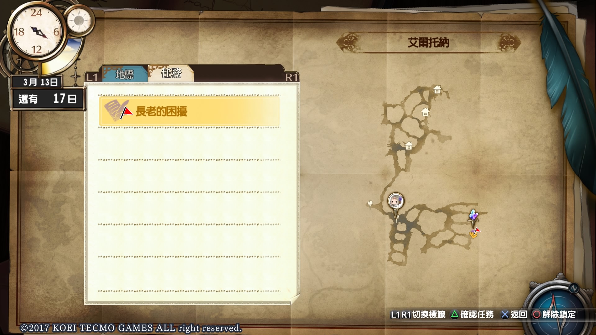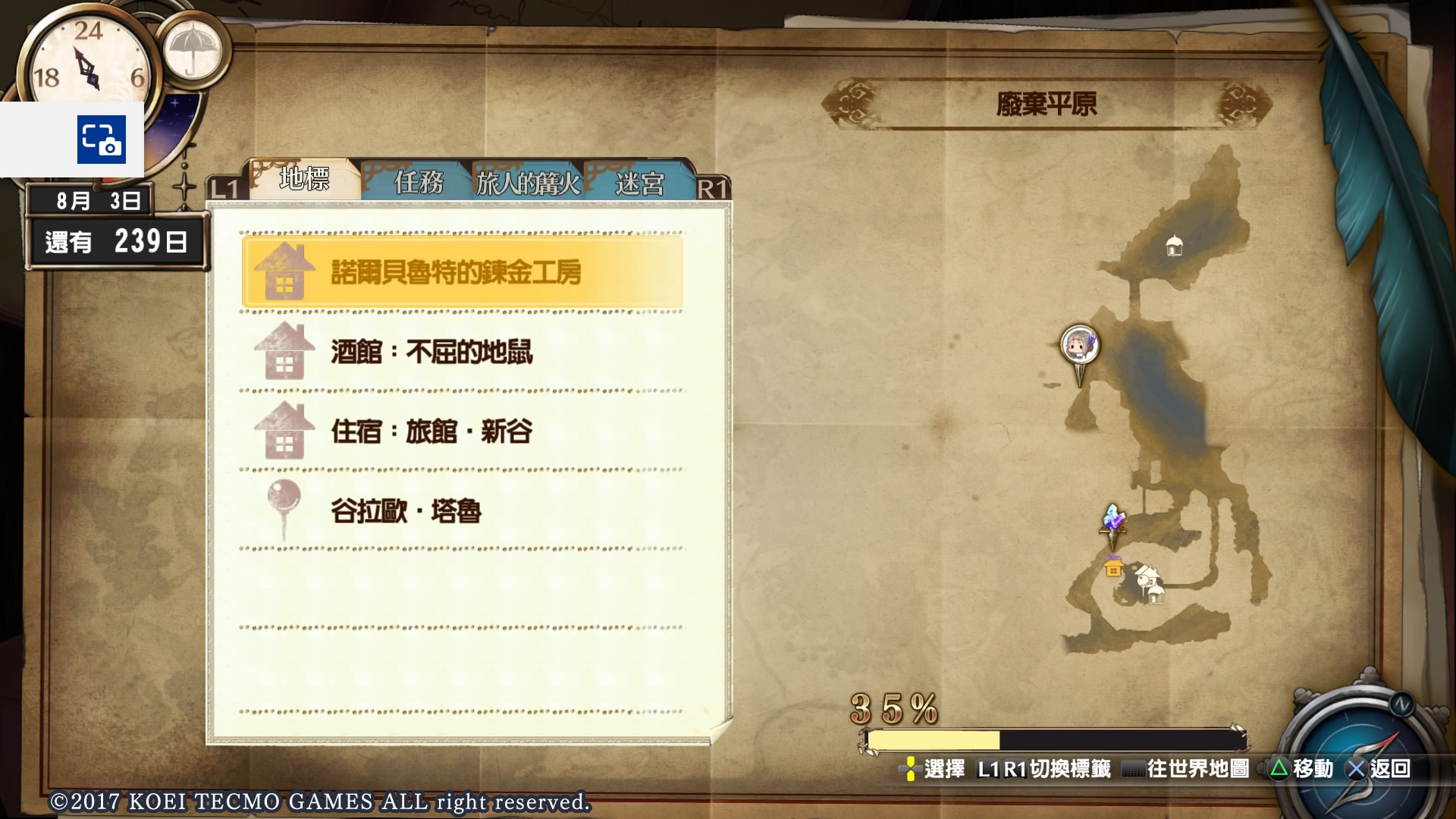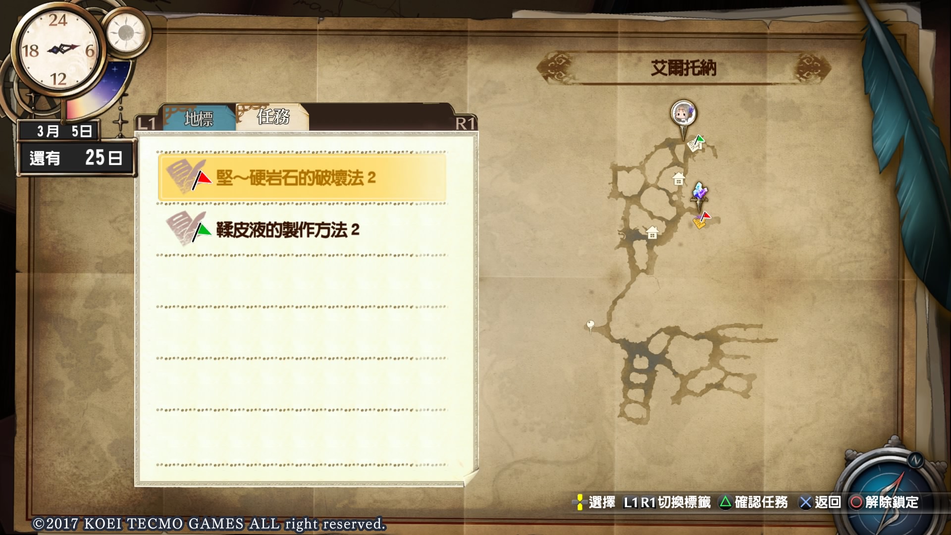 菲莉丝出门找人对话获得炼金灵感,从这时开始推荐善用大地图标记任务,小地图跑图。按 「Touch Pad」 进入大地图,「L1」、「R1」 切换到任务栏,点击任务即可在地图上标记。方便小地图跑图时,查看是不是跑对位置(我只到玩到很后面的时候才知道这个技巧,大雾。)