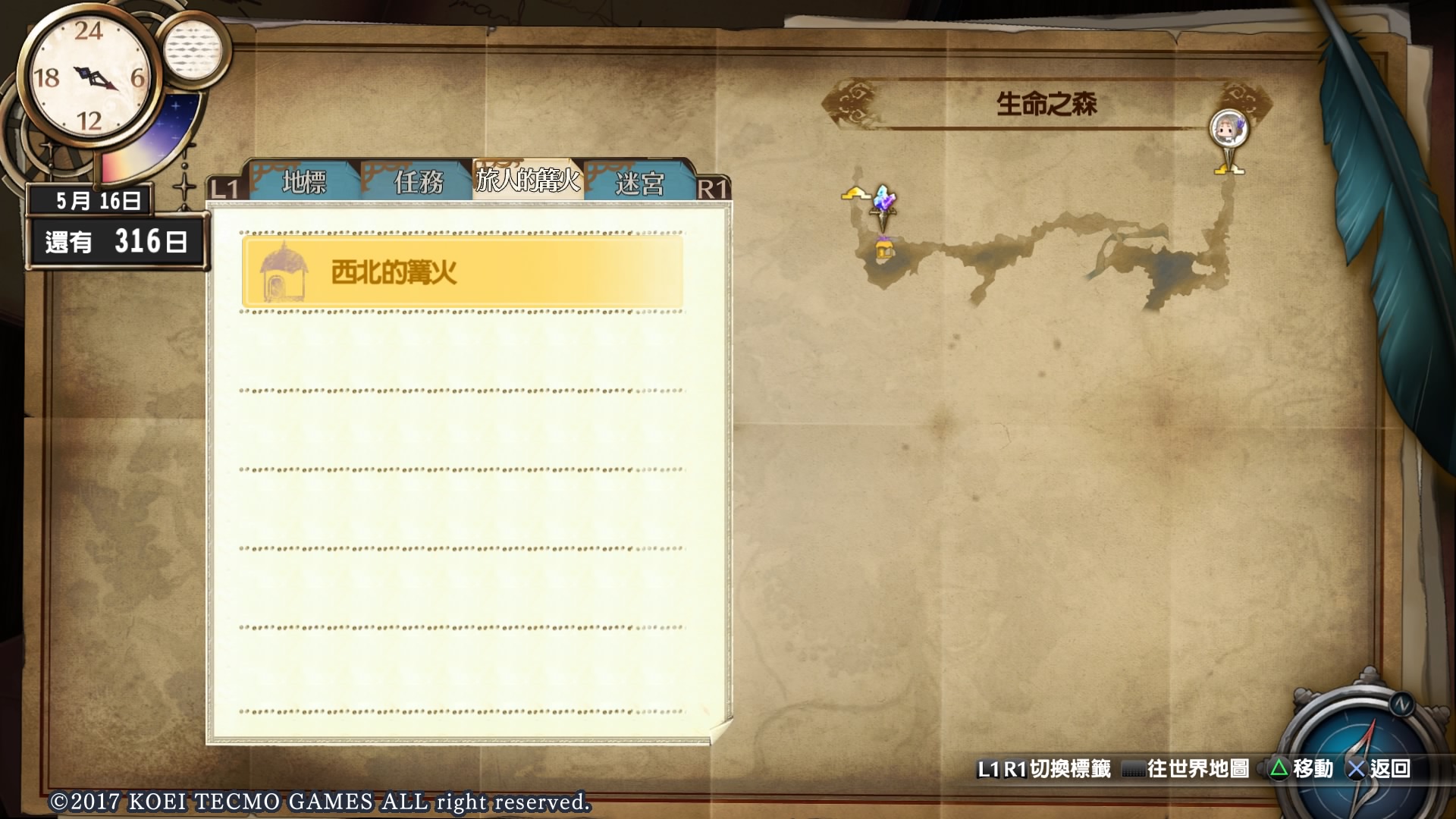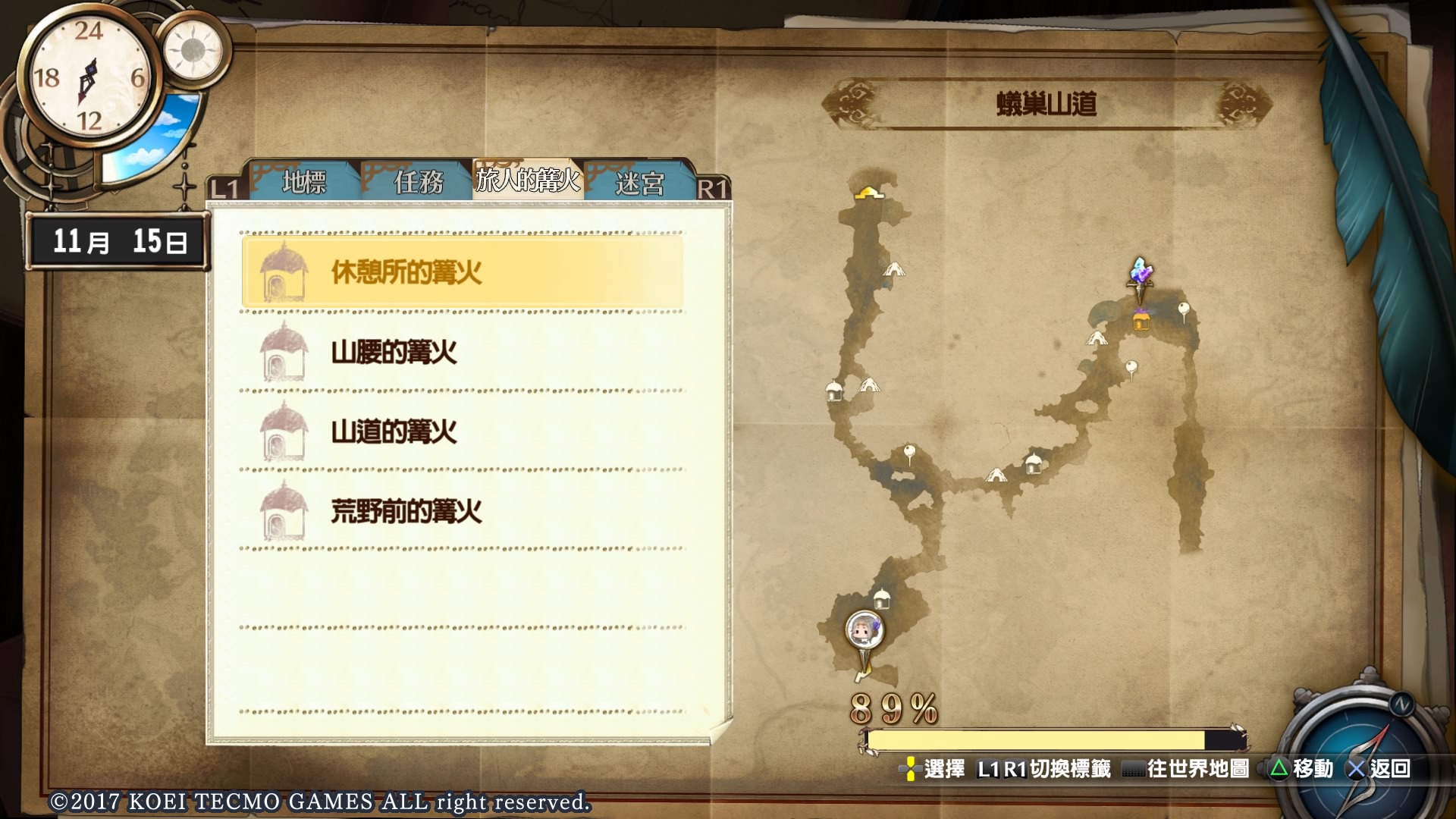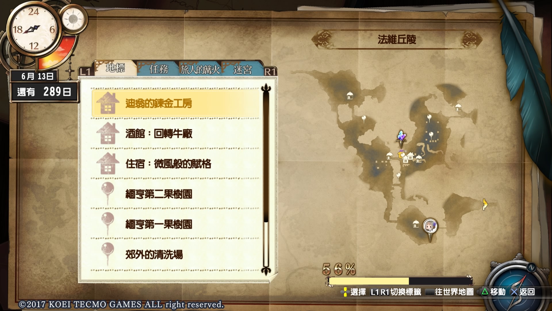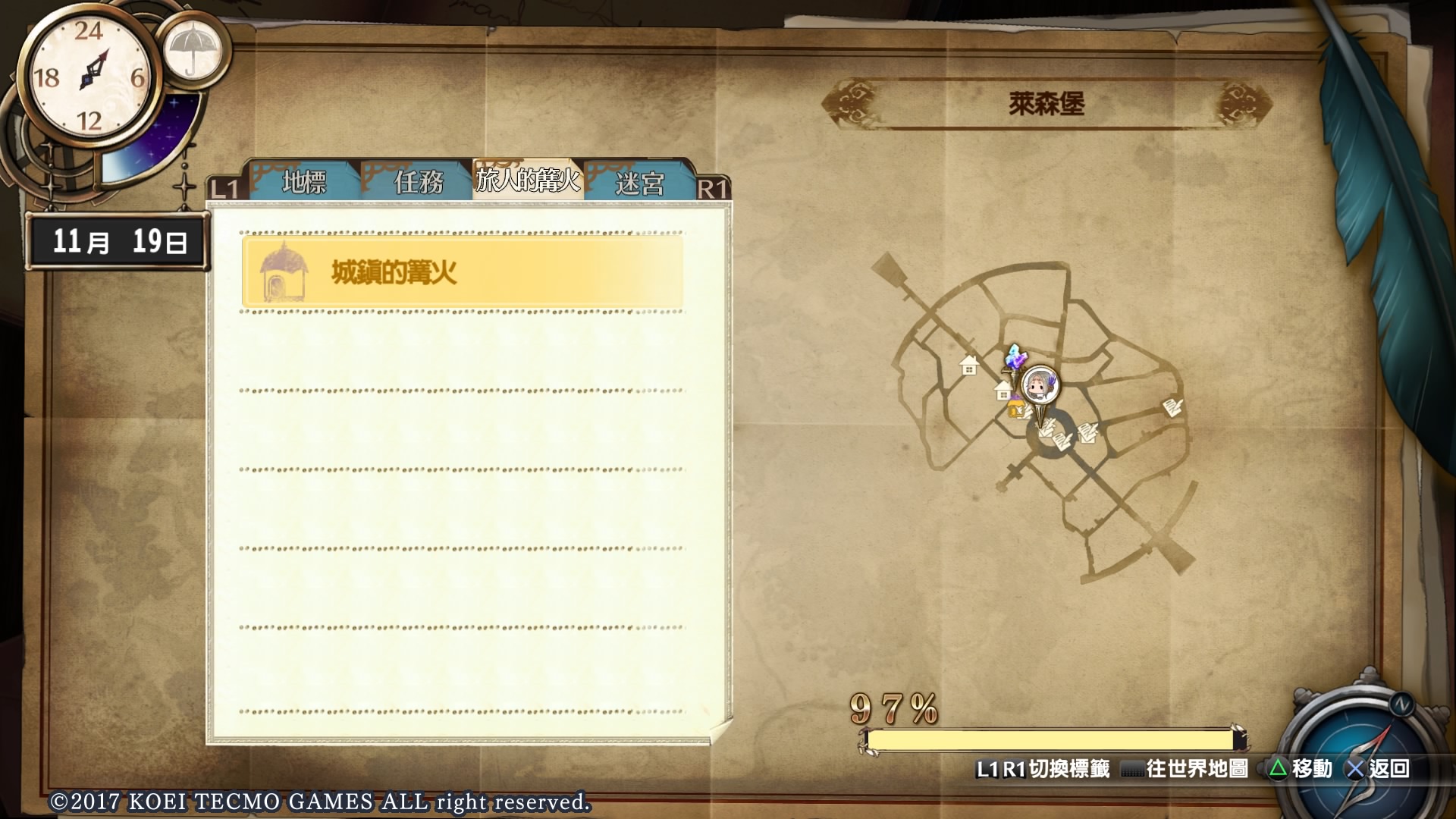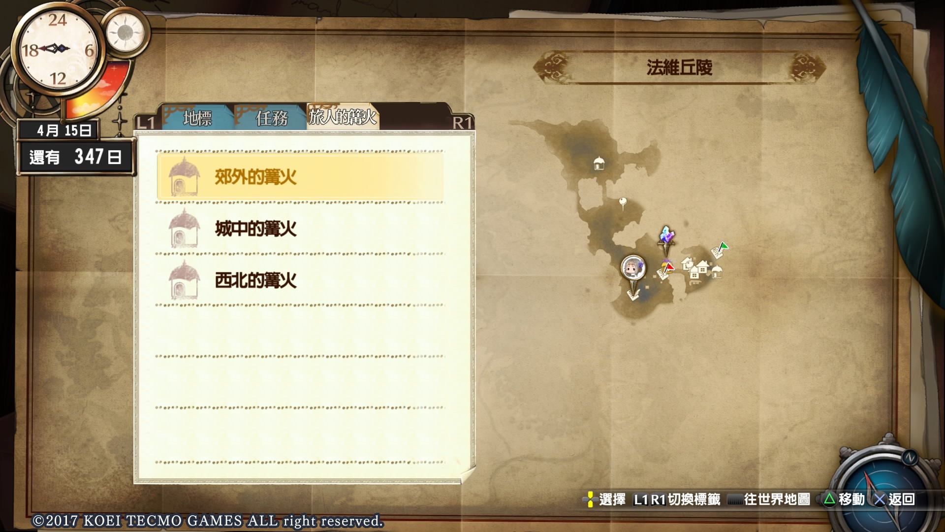 菲莉丝出门找人对话获得炼金灵感,从这时开始推荐善用大地图标记任务,小地图跑图。按 「Touch Pad」 进入大地图,「L1」、「R1」 切换到任务栏,点击任务即可在地图上标记。方便小地图跑图时,查看是不是跑对位置(我只到玩到很后面的时候才知道这个技巧,大雾。)