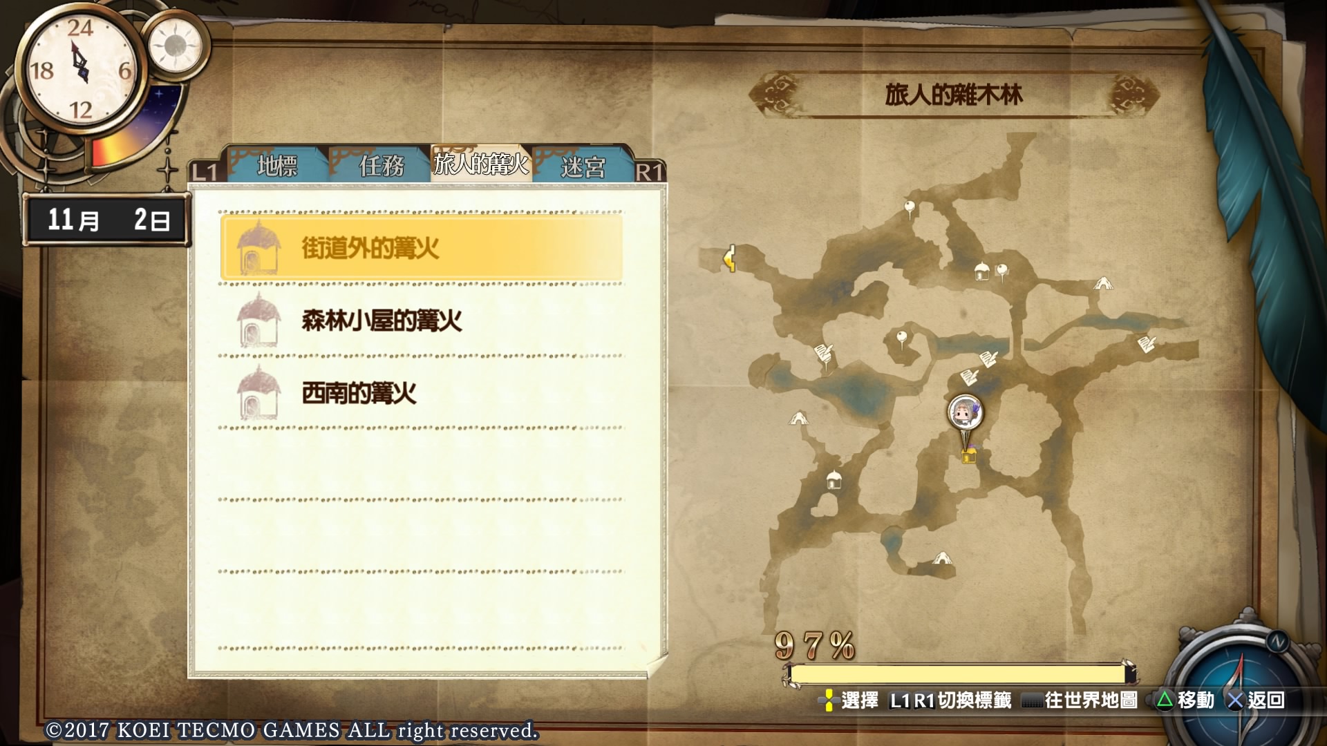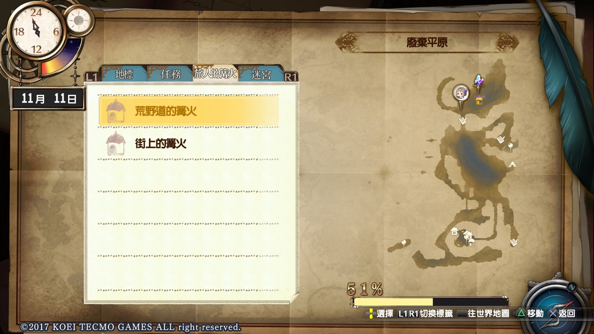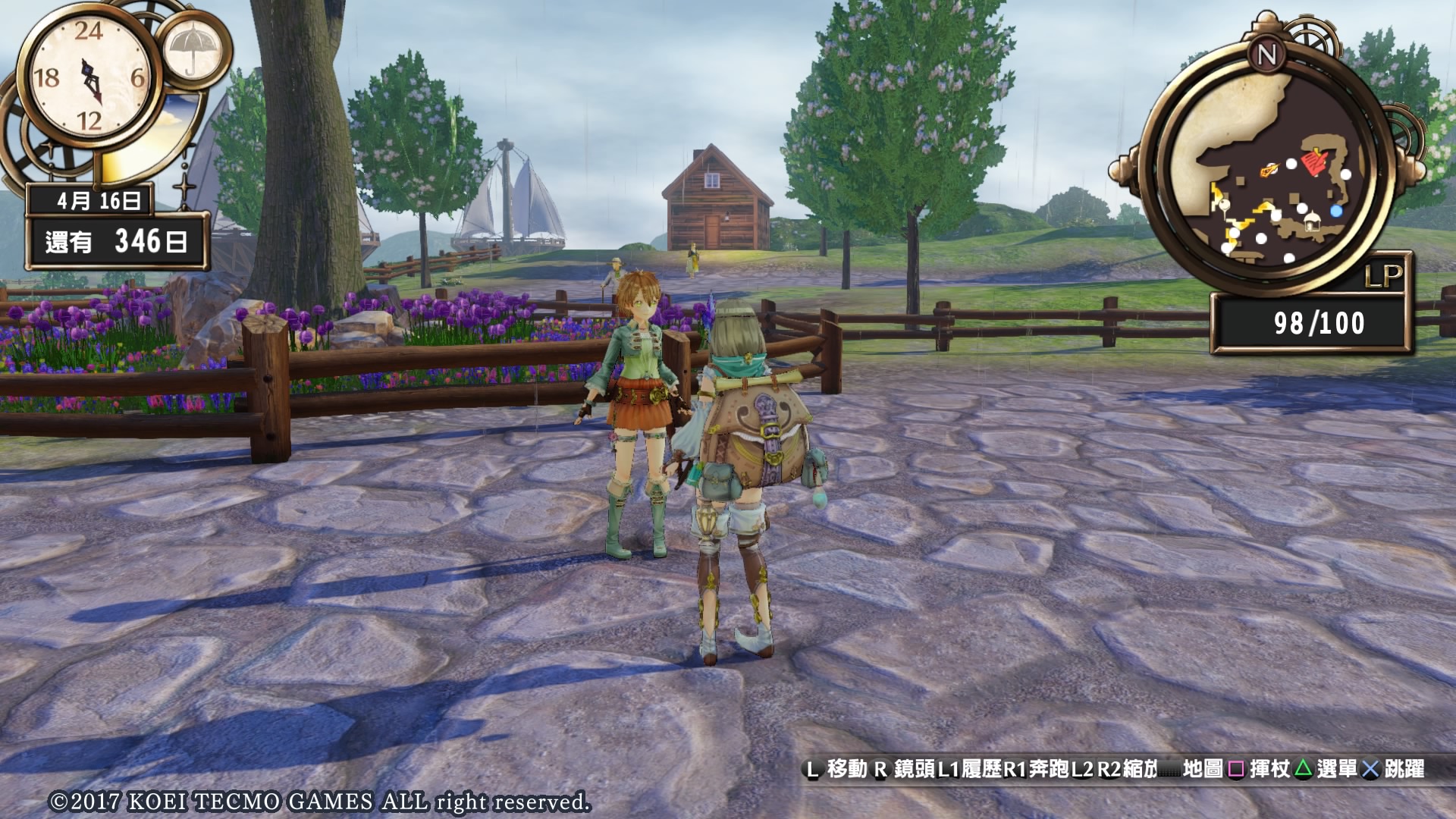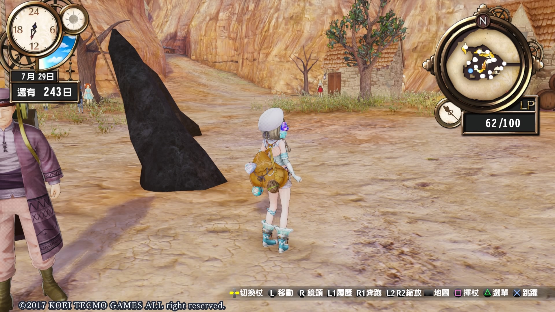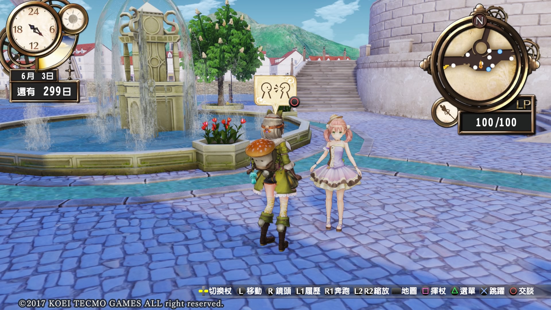 菲莉丝出门找人对话获得炼金灵感,从这时开始推荐善用大地图标记任务,小地图跑图。按 「Touch Pad」 进入大地图,「L1」、「R1」 切换到任务栏,点击任务即可在地图上标记。方便小地图跑图时,查看是不是跑对位置(我只到玩到很后面的时候才知道这个技巧,大雾。)