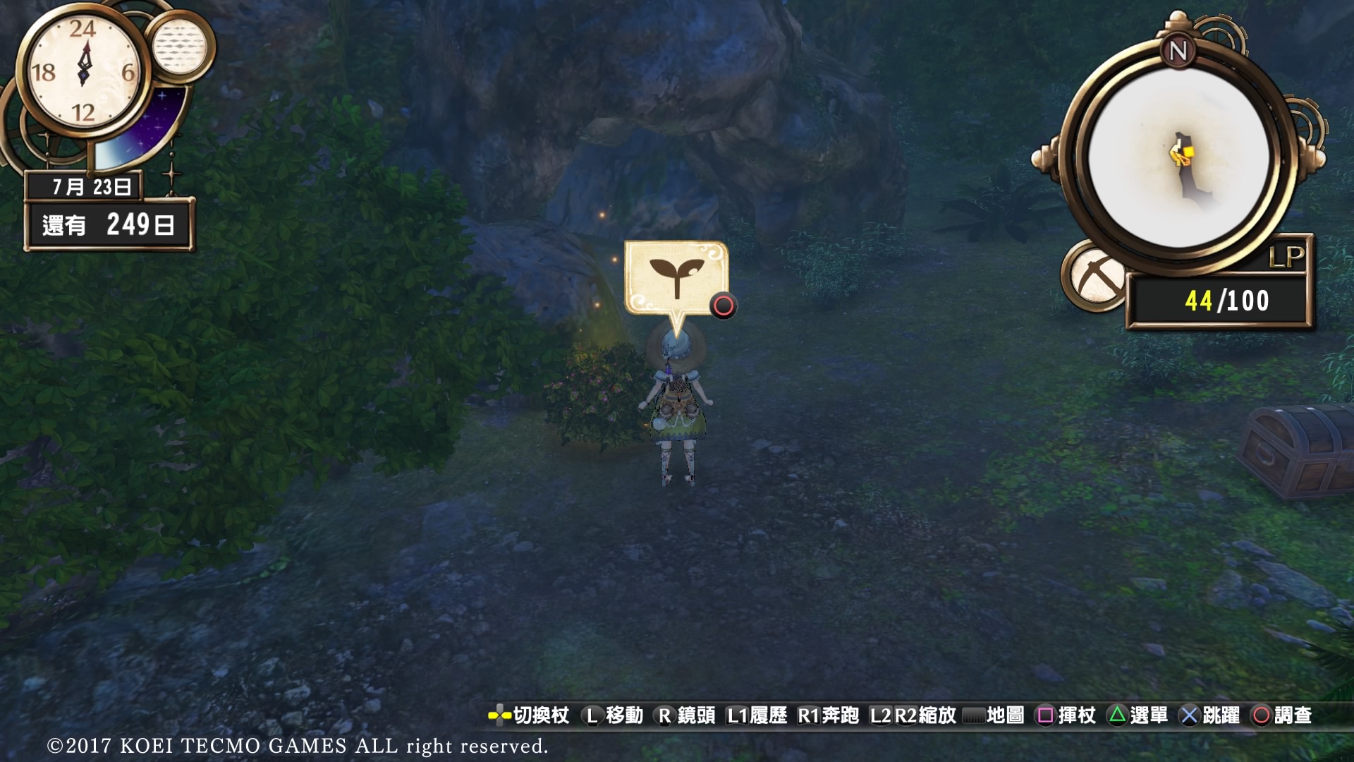 往前走几步,会有篝火教学。建议立刻在不远处的篝火处搭建工房,会有 LP 教学,LP 如果低于0,就会强制休息,低于50,采集、战斗的效果都会降低。此时的工房已经解锁 BGM 更换,同时菲莉丝发想出十字镐和中和剂 · 红。