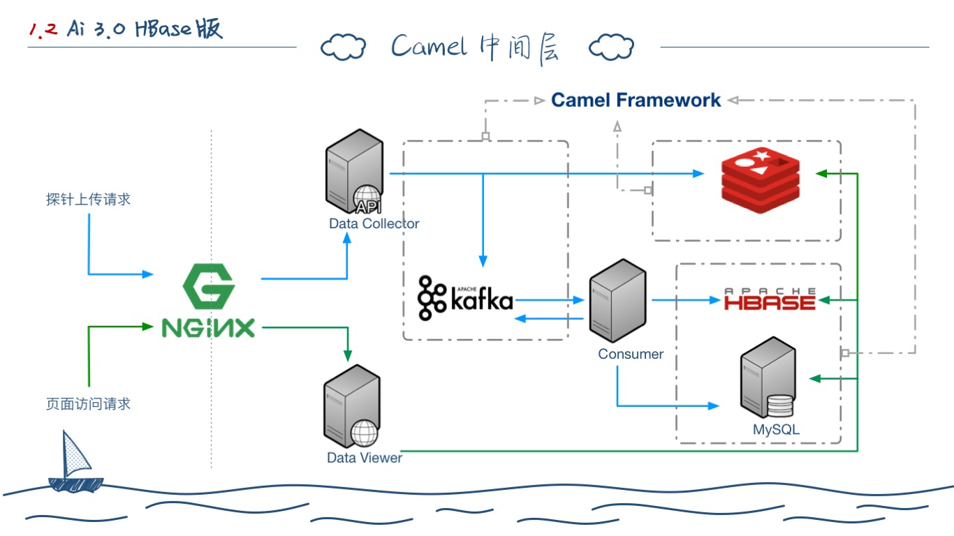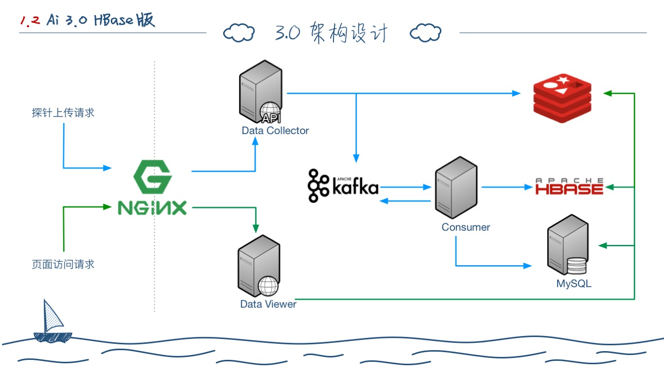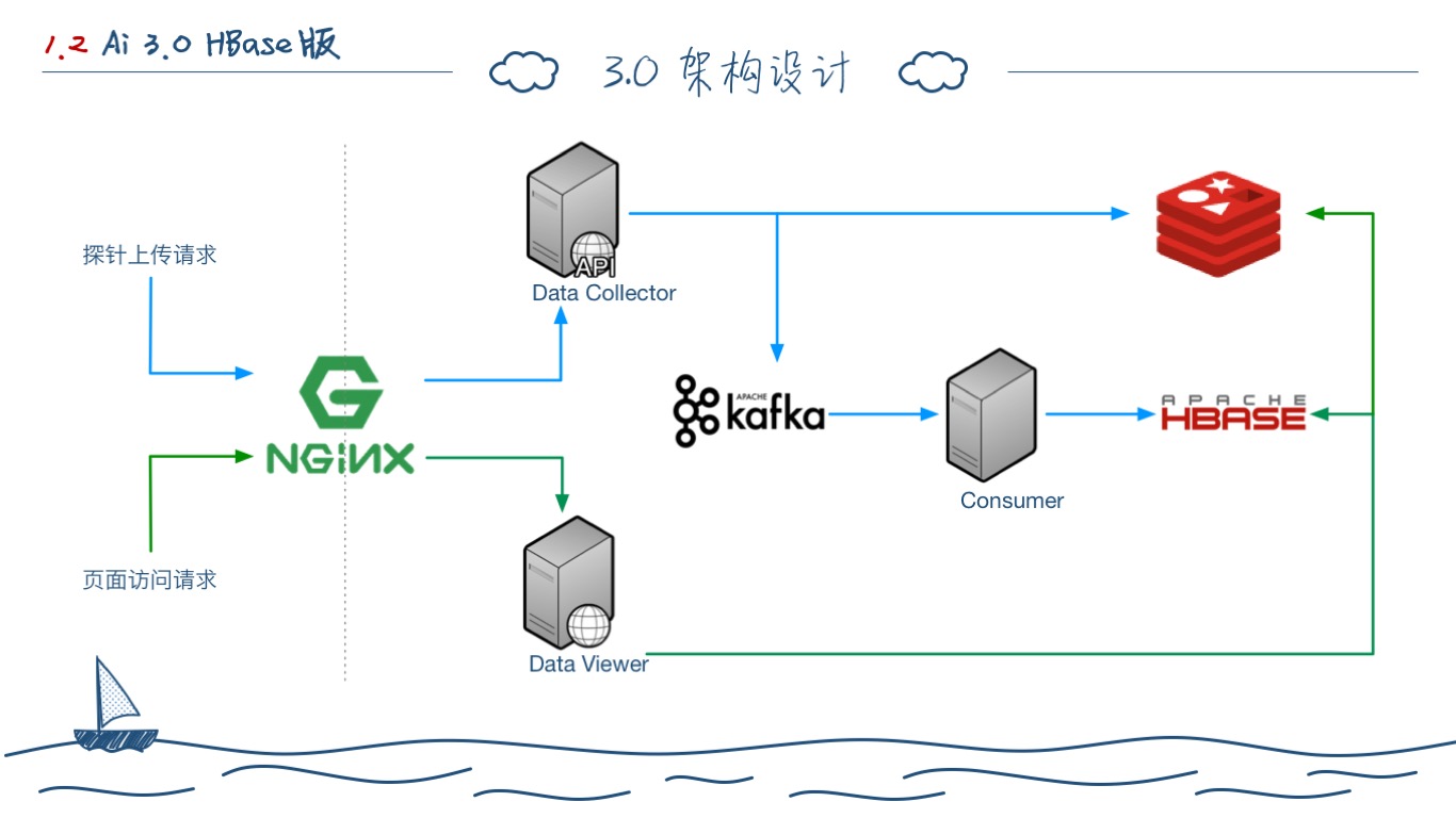 在 2014 年初 OneAPM 基于用户需求和学习国外同类产品 NewRelic 开发了第一版 Ai 3.0。它的架构非常简单,就是一个收集端收集探针的数据写入Kafka,然后落到HBase里,还有一个数据展示端直接查询HBase的数据做展示。