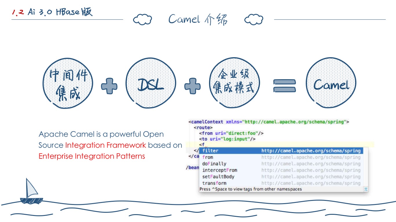 Camel 用官方的话来说,就是基于 Enterprise Integration Patterns 的 Integration Framework。在我看来,Camel 在不同的常见中间件上实现集成,Camel 自身定义好链路调用 DSL(URL Scheme 和 Java、Scala、Spring XML 的实现),还有核心的企业级集成模式的设计思想,组成了 Camel 这个框架。