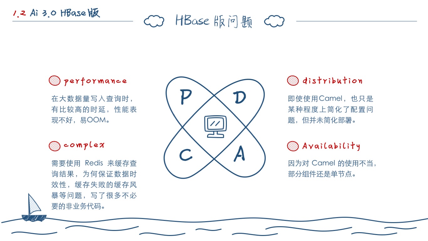 基于 HBase 的查询时延也越来越高,甚至某种程度上,已经不大能支撑新的数据量。当时最高峰的时候,阿里云机器数量高达 20 台。所以,是时候考虑引入新的数据库了。