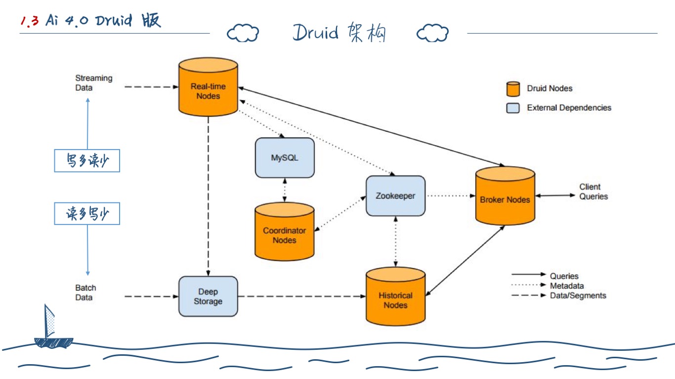 2015年的时候 Druid 架构主要就是上述这张图,Druid 由4大节点组成, Real-time、Coordinator、Broker、Historical 节点,在设计之初就考虑任何一个节点挂了,不会影响其他节点。
