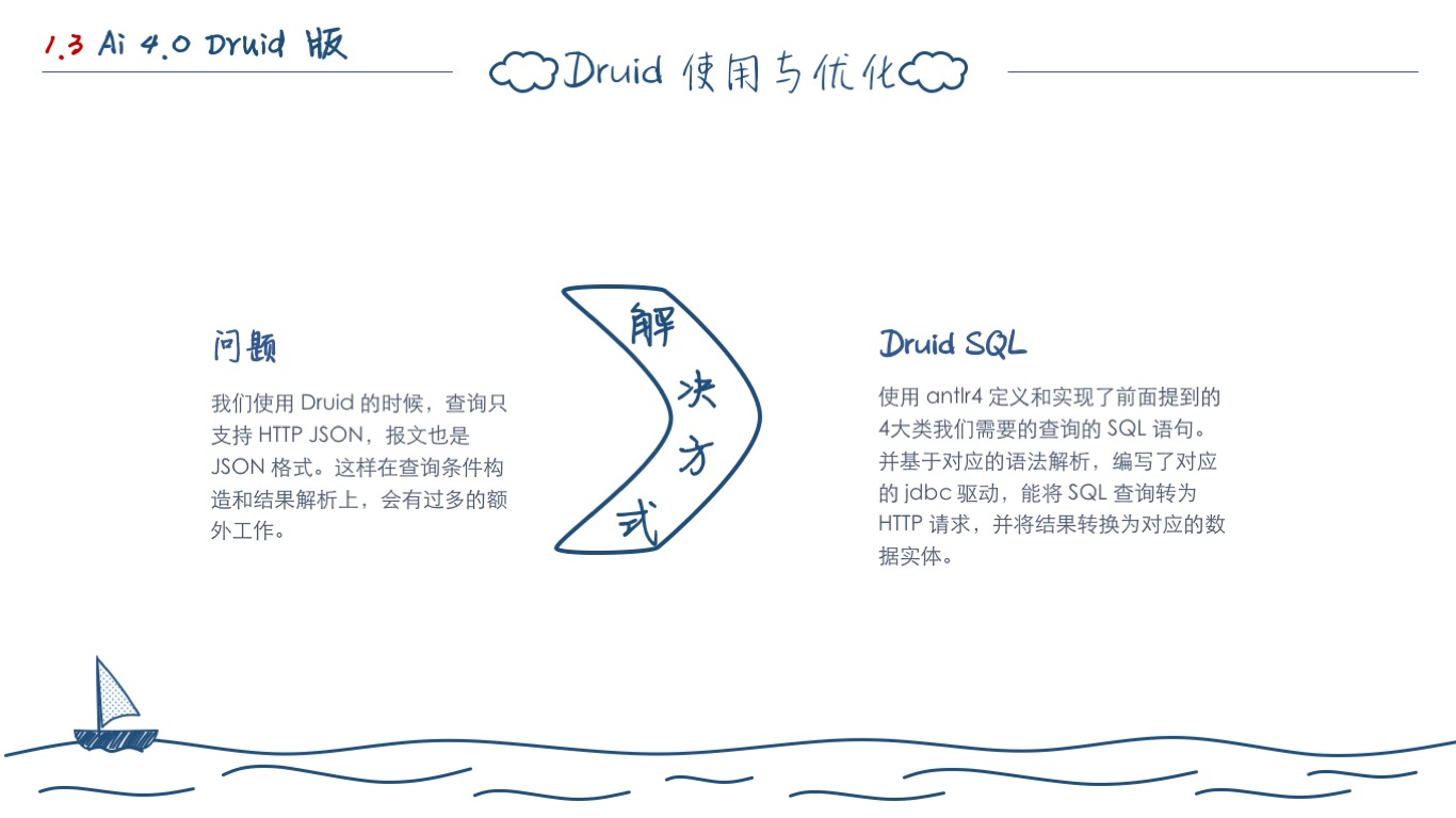 我们需要做的第一个事情,就是如何简化这块集成开发的难度。我们第一时间想到的就是,在这上面开发一套 SQL 查询语法。我们使用 Antlr4 造了一套 Druid SQL,基于它可以解析为直接查询 Druid 的 JSON。