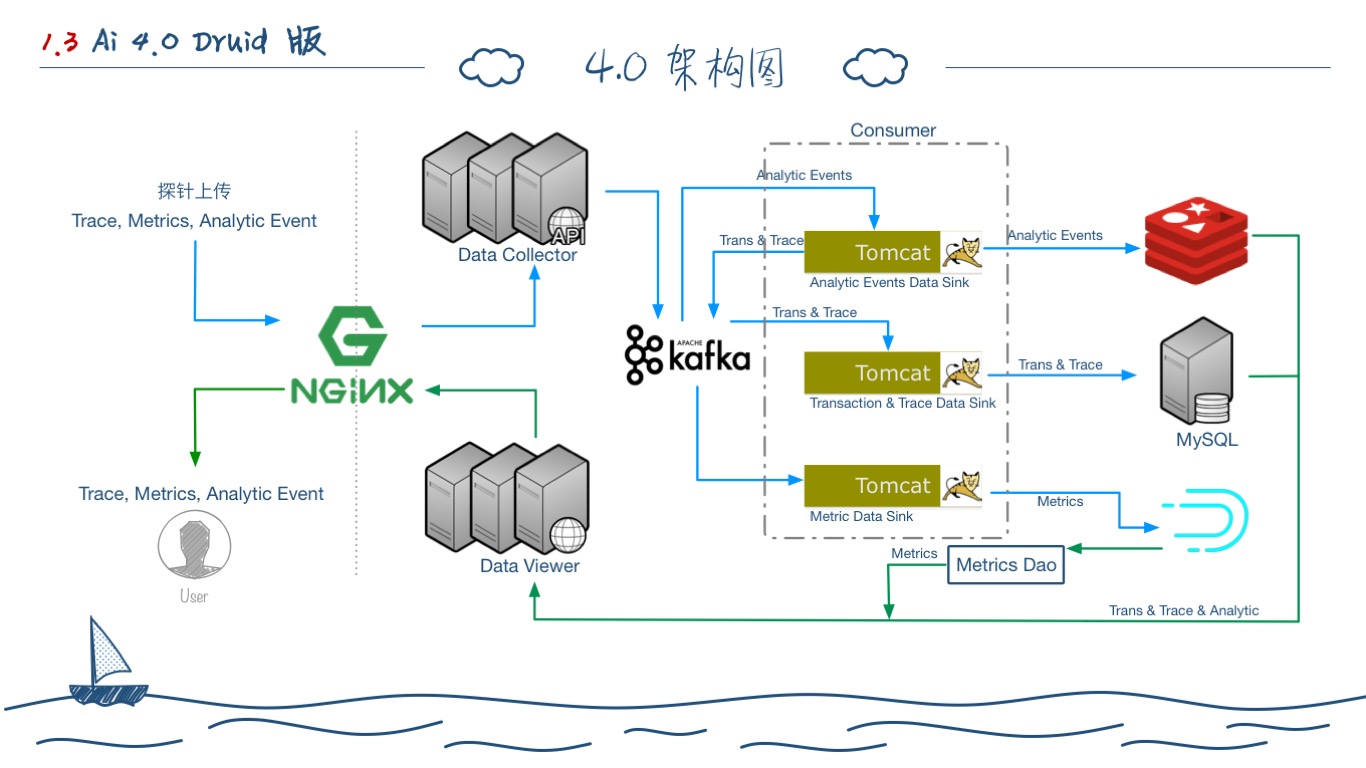 探针上传的数据,分为三大类,Trace、Metrics、Analytic Event。Trace 就是一次完整的调用链记录,Metrics 就是系统和应用的一些指标数据。Analytic 数据使我们在探针中对于一些慢 Trace 数据的详细信息抓取。最终所有的 Metrics 数据都写入 Druid,因为我们要按照不同的查询间隔和时间点去分析展示图表。Traces 和事物类信息直接存储 MySQL,它对应的详细信息还需要从 Druid 查询。对于慢 Trace 一类的分析数据,因为比较大,切实时变化,我们存入到 Redis 内。