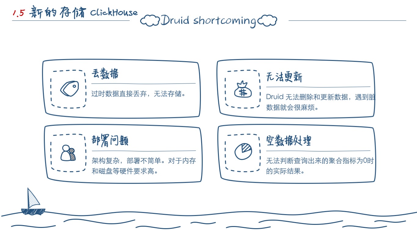 比如,最简单的一个例子,Druid 中查到一个 Metric 指标数据为 0,到底是这个数据没有上传不存在,还是真的为 0,这是需要商榷的。我们有些基于 Druid 进行的基线数据计算,想要在 Druid 中存储,就会遇到 Druid 无法更新的弊端。换句话说,Druid 解决了我们数据写入这个直接问题,查询上适用业务,但是有些难用。
