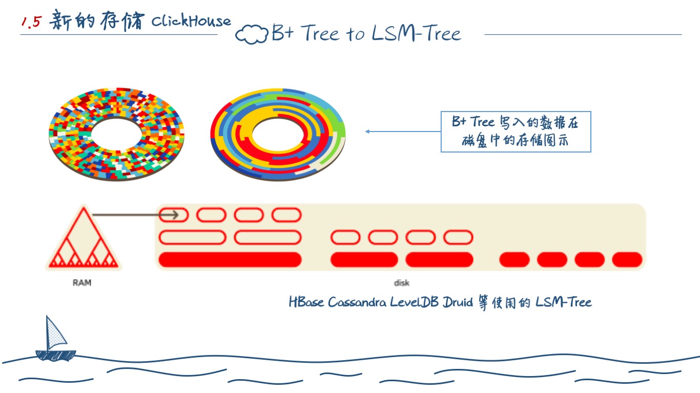 它在内存中和磁盘中分别使用两种不同的树结构存储数据,并同时对外提供查询能力。如 Druid 为例,在内存中的数据,会按照时间范围去聚合排序。然后定时写入磁盘,所以在磁盘中的文件写入的时候已经是排好序的。这也是为何 Druid 的查询一定要提供时间范围,只有这样,才能选取出需要的数据块去查询。