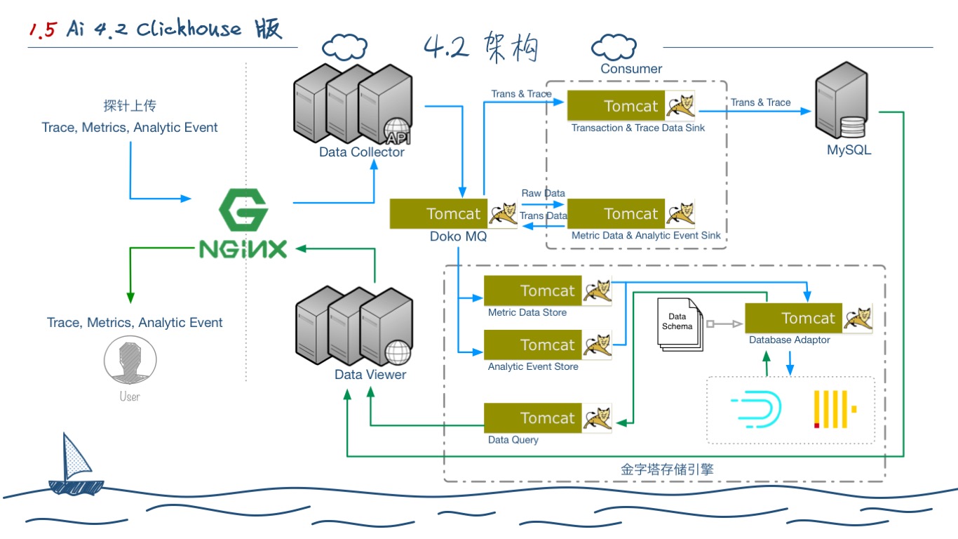 在 2015 年初的时候,企业版开始做架构演进,首先是在存储这块,对于之前用 HBase 的聚合查询部分改用 Druid,对于 Trace 和 Transaction 数据转而使用 MySQL,同时,我们学习国外竞品 dynaTrace 完善了我们的分析模型。