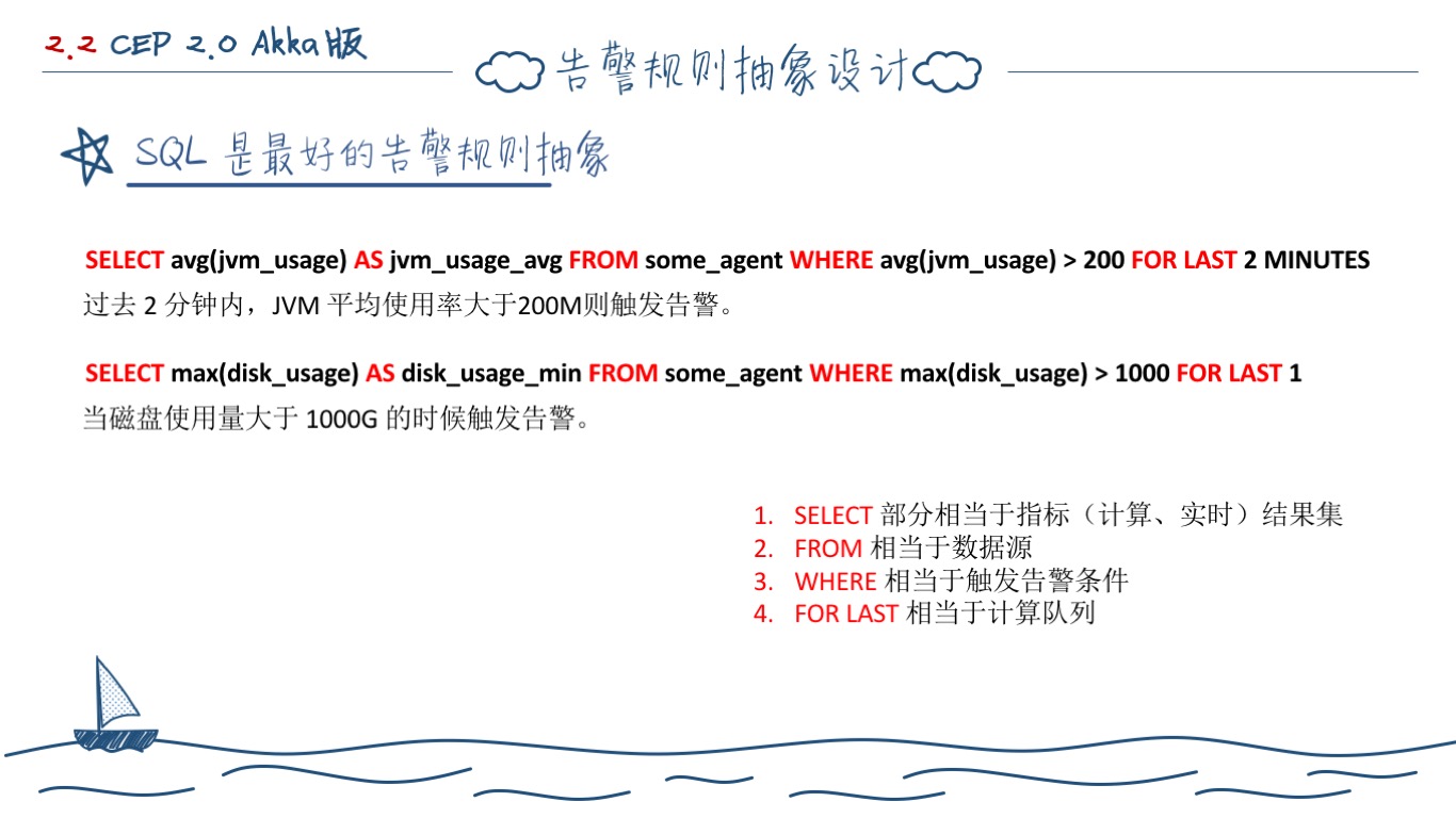 这期间也参考了 Esper 之类的开源项目,比较后我们惊喜地发现,最好的告警规则定义方式就是 SQL。