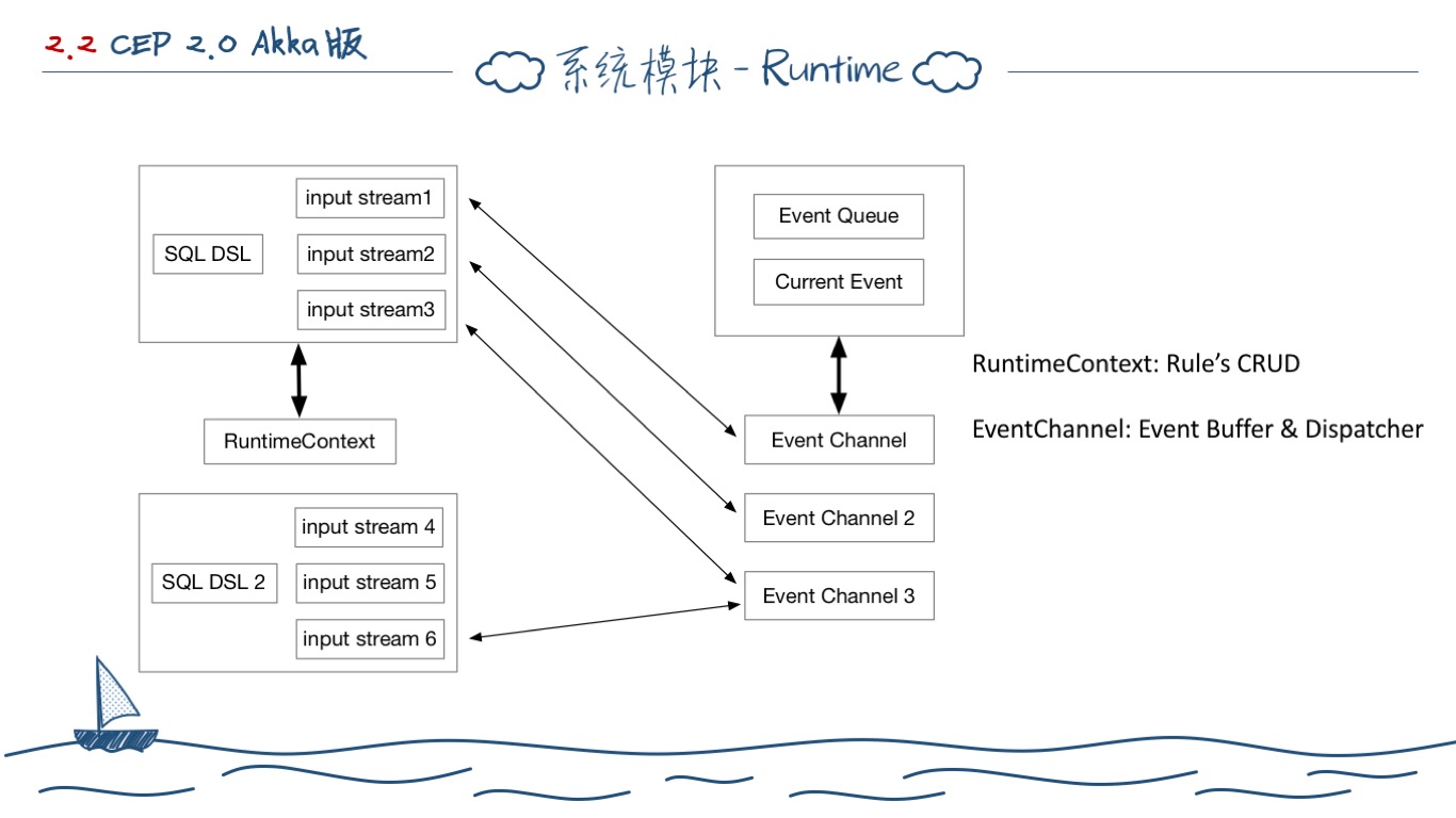 一个 RuntimeContext 示例可能对应多个 EventChannel,一个 EventChannel 也可能对应多个 RuntimeContext,二者基于一个唯一的 key 关联起来。我们修改规则的时候,需要修改对应的 RuntimeContext。事件来了要计算的时候,是直接 sink 到 EventChannel 中。