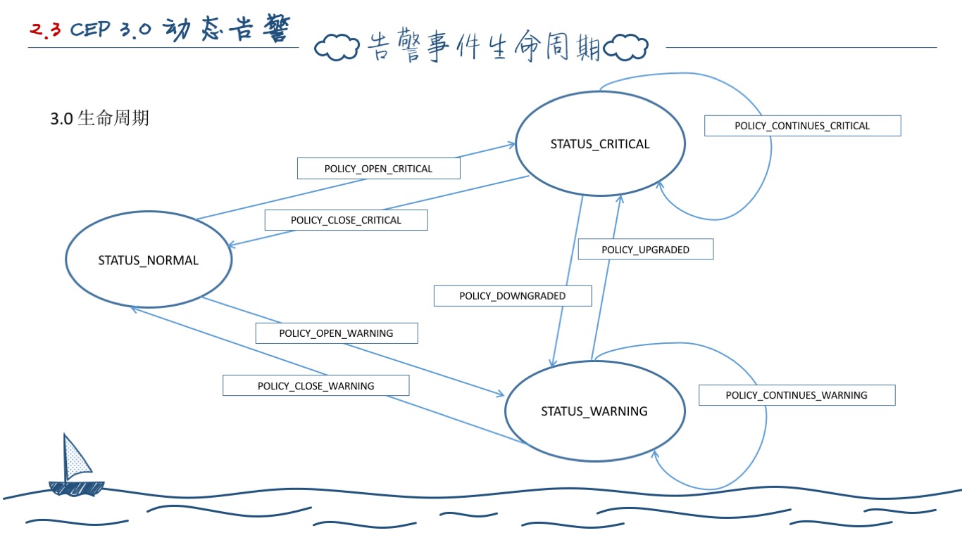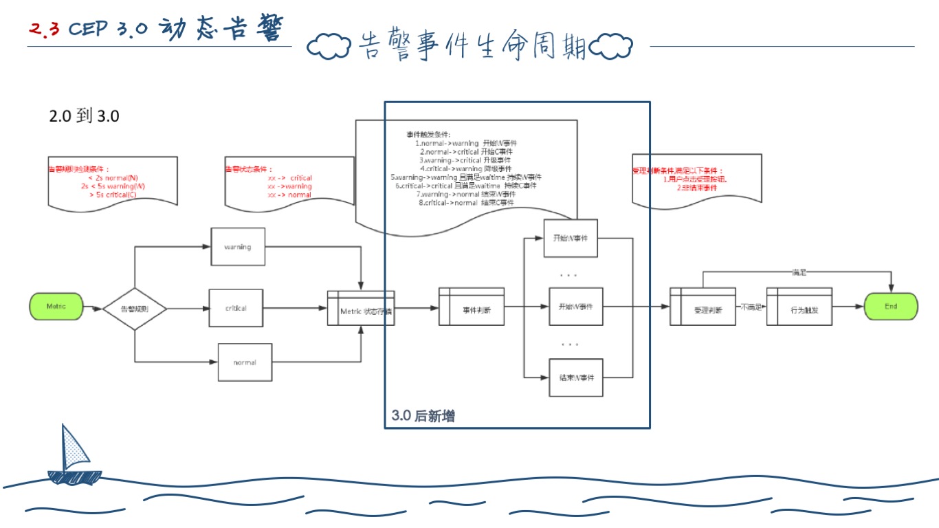 2.0 的时候,告警系统只产生三类事件,普通事件、警告事件、严重事件。我们调研之后发现,其实用户在意的不是这类事件,而是这三类事件相互转换之后产生的事件。