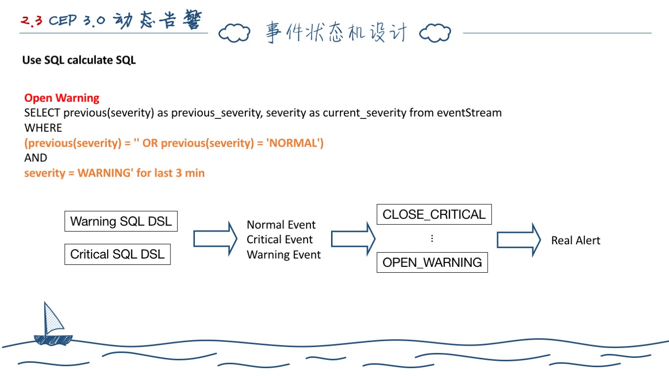 之前开发的 Engine 模块结合 Runtime 模块完全可以解决这个问题,我们只需要按照之前定义的 8 个事件转换状态定义 8条 SQL,配置三个子 RuntimeContext 即可解决这个问题。比如开启警告事件,它的 SQL 定义如上。也就是之前一个告警事件如果为空或者为NORMAL事件,当前这条事件为警告事件,则生成开启告警事件。