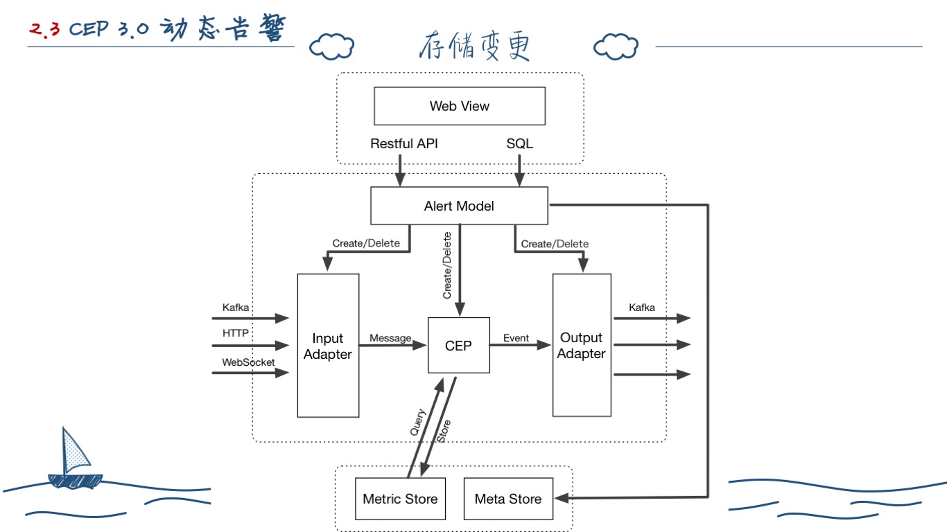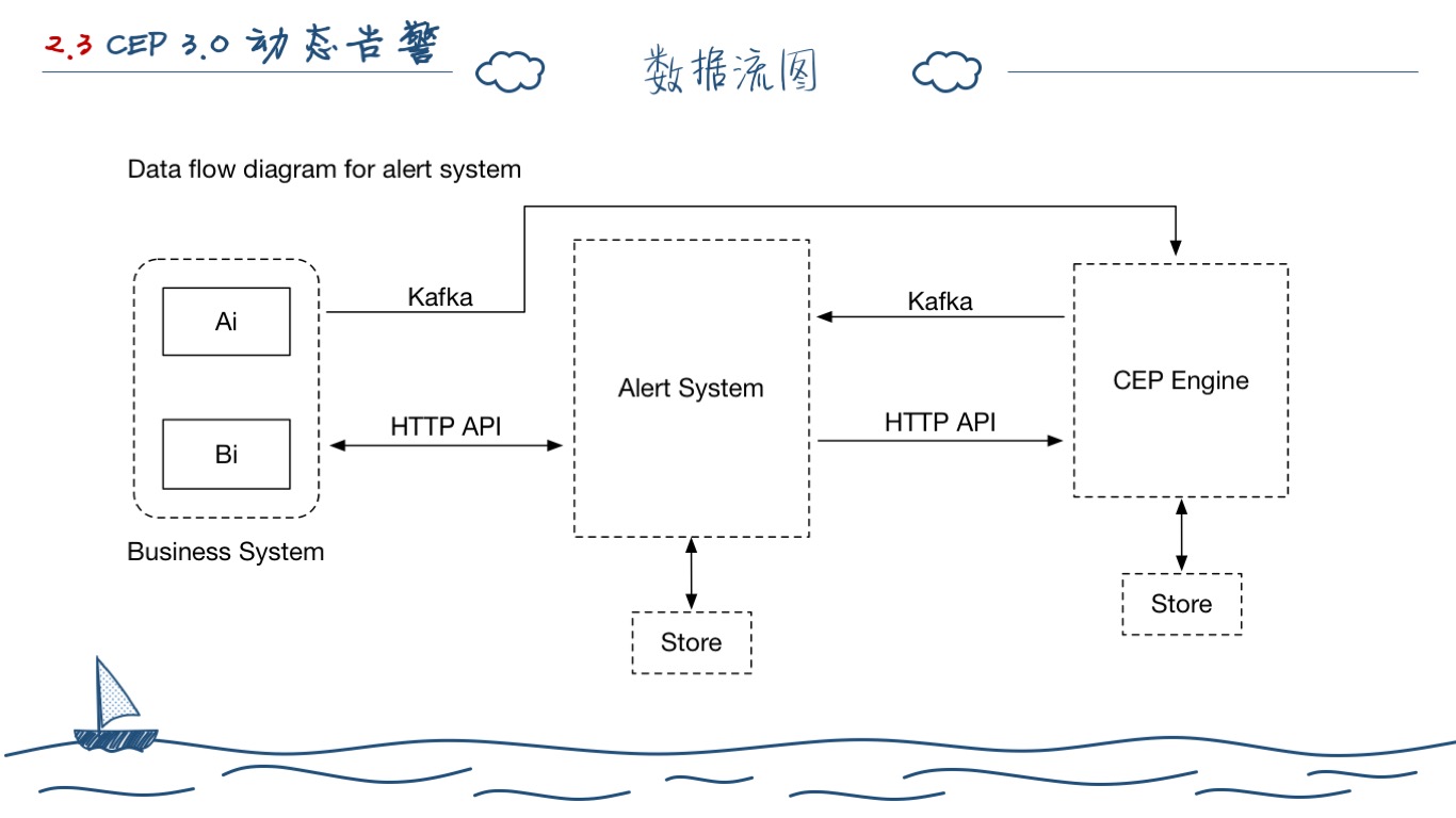 为了应对 2.0 版本的接入麻烦,因为构造 SQL、告警通知行为等在 2.0 版本都是外包给业务线自己做的,我们只是打造了一个小而美的 CEP 引擎。所以只有主要的产品 Ai 接入了我们系统。为此,我们把 Ai 中开发的和告警相对于的代码剥离,专门打造了 CEP 上层的告警系统,并要求业务方提供了应用、指标等 API。自行消费处理 Kafka 中的告警事件,触发行为。
