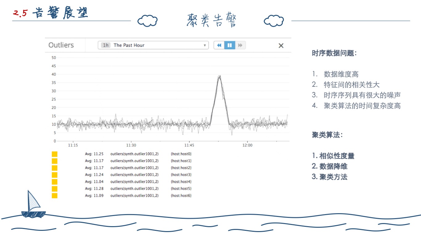 常见的聚类算法有三类:基于空间划分的、基于层次聚类的和基于密度聚类的方法。聚类算法一般要求数据具有多个维度,从而能够满足对海量样本进行距离(相似性)度量,从而将数据划分为多个类别。其中维度特征一般分为CPU利用率、磁盘利用率、I/O使用情况、内存利用率、网络吞吐量等。